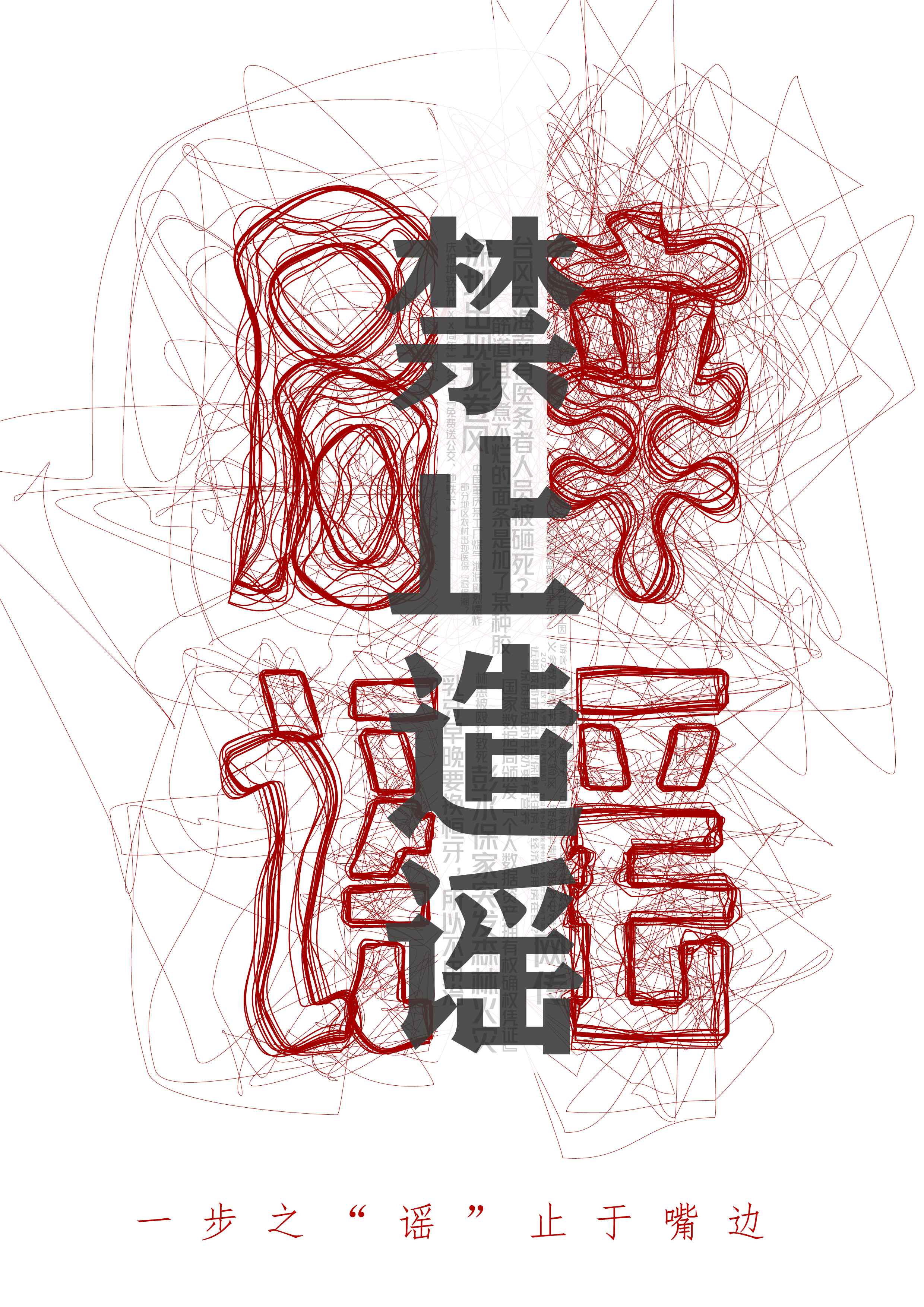 本作品緊扣辟謠主題,海報(bào)主題的辟謠二字利用了分割、粗糙化去設(shè)計(jì),中間禁止造謠文字占據(jù)畫面中心,體現(xiàn)出海報(bào)想傳達(dá)的中心思想——拒絕網(wǎng)絡(luò)謠言,