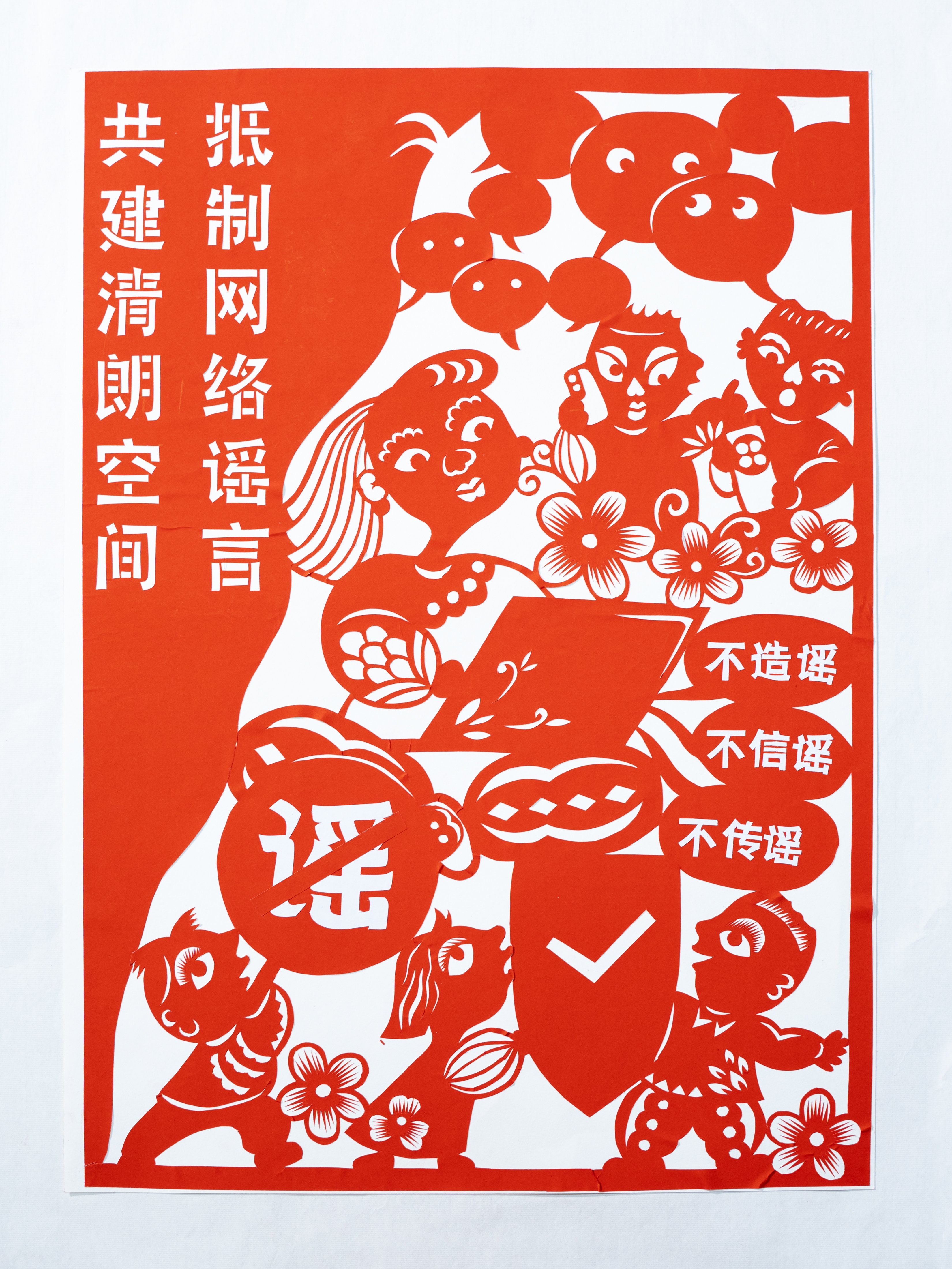 玉林興業(yè)縣創(chuàng)新性的將網(wǎng)絡(luò)辟謠元素融入剪紙藝術(shù)打造“辟謠+非遺剪紙”的新型宣傳模式。