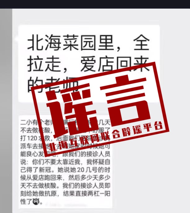 網(wǎng)傳北海市某老師隱瞞行程,躲避核酸檢測,因身體不適撥打120急救后檢測呈陽性。經(jīng)核實,此傳言中的老師并非北海市老師,此事件也并非在北海市發(fā)生,此信息為謠言。