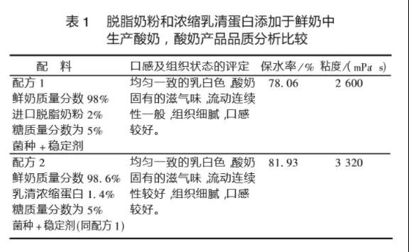 至于乳清蛋白含量[4],有這樣一個試驗:取兩份酸奶,各自加了不同的配方進行發(fā)酵,一種不添加乳清蛋白,另一種添加了1.4%的乳清濃縮蛋白。結(jié)果發(fā)現(xiàn),添加了乳清濃縮蛋白的酸奶無論是從保水率還是粘稠度上,都比不添加的那組要高。這就說明了,酸奶中添加乳清蛋白確實可以提高酸奶的品質(zhì)和粘稠度。