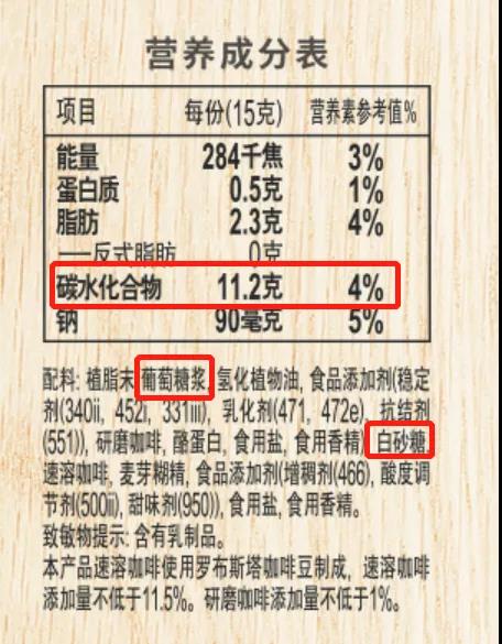 常見的添加糖包括:白砂糖、紅糖、冰糖、果葡糖漿、葡萄糖漿、玉米糖漿、麥芽糖漿、蜂蜜、果糖等。比如下圖這款速溶咖啡其中就添加了葡萄糖漿和白砂糖。通過營養(yǎng)成分表可以得知,碳水化合物含量為11.2g/15g(一袋),也就是說,喝下去一袋這樣的速溶咖啡,攝入的糖約為11.2g。