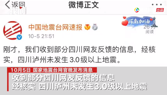 就在大家驚魂未定的時(shí)候,21時(shí)51分,中國(guó)地震臺(tái)網(wǎng)官方微博發(fā)布信息稱:經(jīng)核實(shí),四川瀘州未發(fā)生3.0級(jí)以上地震。