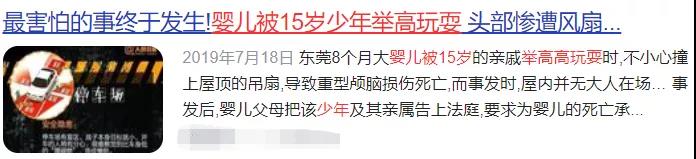 2018年,東莞8個(gè)月大嬰兒被15歲的親戚舉高高玩耍時(shí),不慎撞上屋頂?shù)跎龋瑢?dǎo)致重型顱腦損傷死亡……