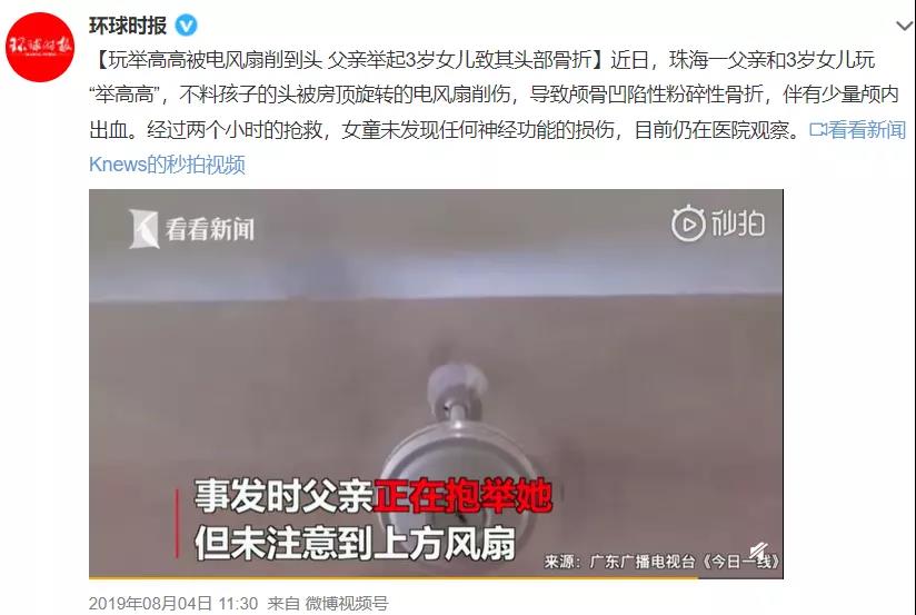 2019年,珠海一位爸爸將3歲女兒舉高高時(shí),忘記了頭頂旋轉(zhuǎn)的吊扇,結(jié)果葉片瞬間從孩子頭上削過(guò),鮮血直流……