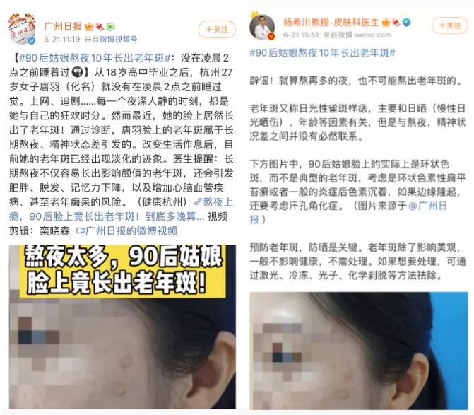 #90后姑娘熬夜十年長(zhǎng)出老年斑#的熱搜話題一出,想必很多已經(jīng)習(xí)慣于“熬最深的夜、涂最貴的眼霜”的年輕人們,在被戳中痛處,不免心里一緊。然而,很快就有皮膚科專家給大家發(fā)放安心藥:熬再多的夜也熬不出來老年斑,這姑娘臉上的斑應(yīng)該是環(huán)狀色斑!