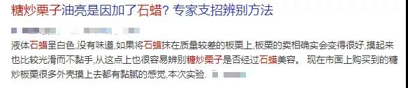 網(wǎng)上還有傳言,說路邊買到的油光發(fā)亮的“糖炒栗子”加了石蠟吃多會(huì)致癌,讓部分人對糖炒栗子望而卻步。