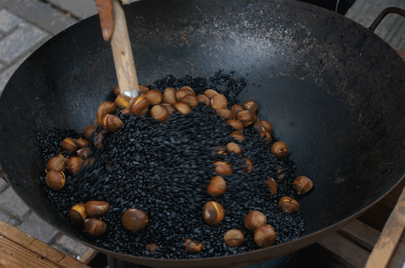 糖炒栗子跟石子一起炒,如同鹽鋦、泥沙包裹等烹飪食物方法一樣,是智慧的中國人民發(fā)明傳承的食物制備方式之一,是固態(tài)介質(zhì)傳熱制熟工藝的實(shí)際應(yīng)用。