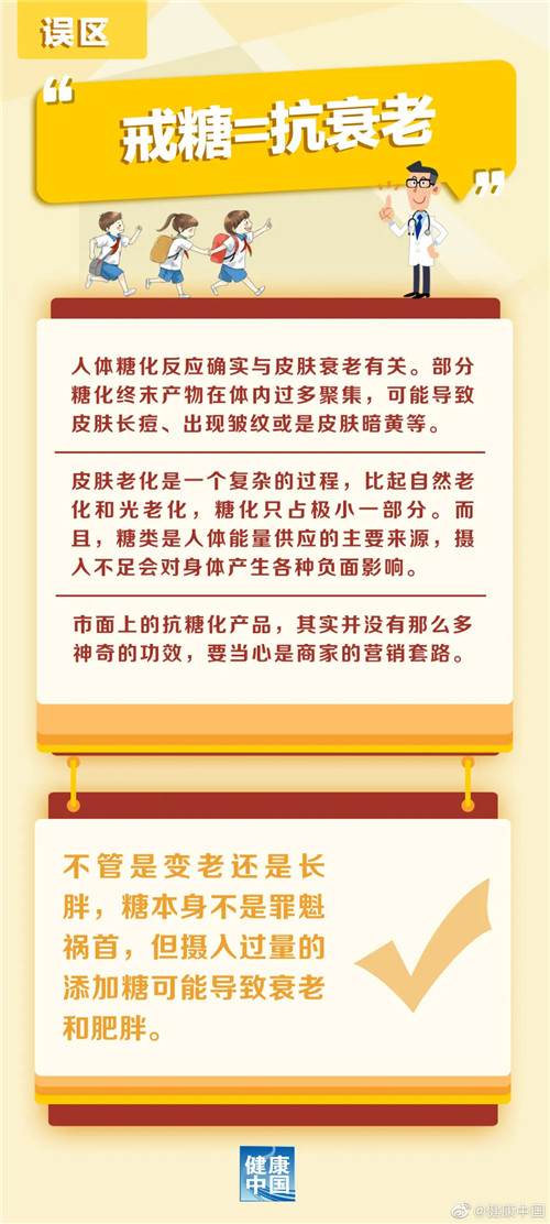 不管變老還是長(zhǎng)胖,糖本身不是罪魁禍?zhǔn)?,但攝入過量的添加糖可能導(dǎo)致衰老或肥胖。世界衛(wèi)生組織和《中國居民膳食指南(2016)》均建議:每天攝入的添加糖最好控制在25克以下。大量攝入添加糖,會(huì)增加超重、肥胖、齲齒的發(fā)生風(fēng)險(xiǎn),對(duì)于皮膚來說,也會(huì)導(dǎo)致痤瘡、皮膚衰老等,甚至?xí)l(fā)心腦血管疾病、糖尿病、肝病等。