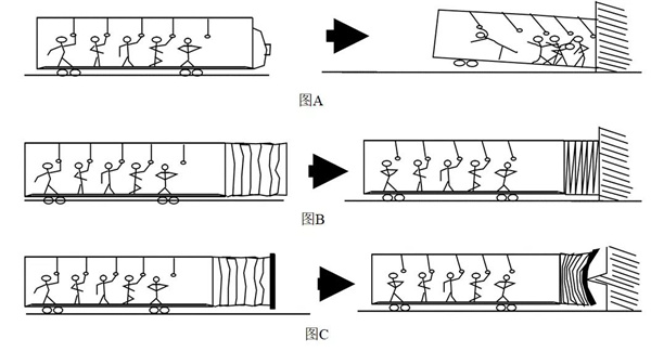 模擬頭盔防護(hù)原理:A 無防護(hù),B 緩沖層,C 緩沖層+外殼(擋住尖銳物) | 作者制圖