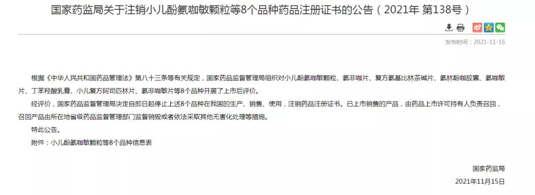 記者求證發(fā)現(xiàn),這條消息是真的,出處是11月15日《國家藥監(jiān)局關(guān)于注銷小兒酚氨咖敏顆粒等8個(gè)品種藥品注冊(cè)證書的公告(2021年 第138號(hào))》 (以下簡(jiǎn)稱“公告”)。