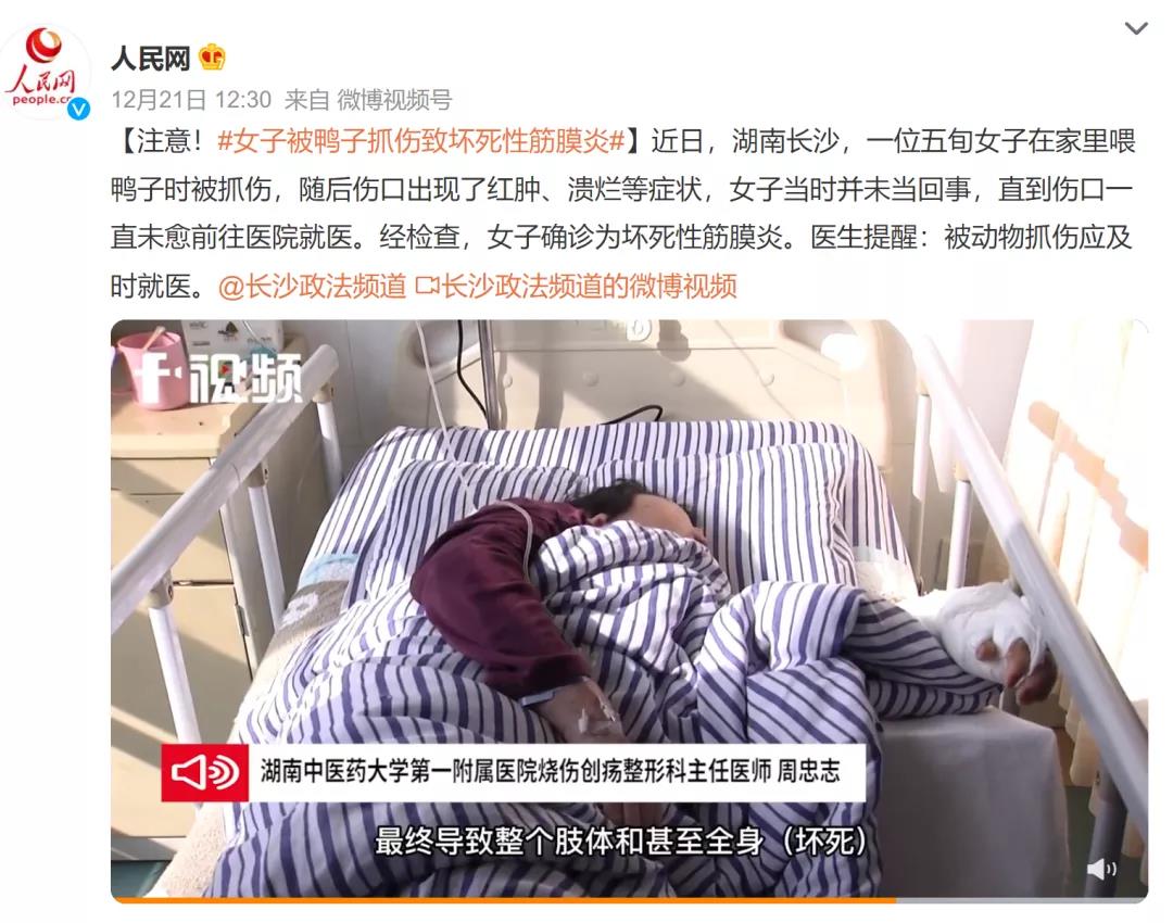 據(jù)長沙電視臺近日報道,一位五旬女子在家里喂鴨子時被抓傷,隨后傷口出現(xiàn)了紅腫、潰爛等癥狀,女子當(dāng)時并未當(dāng)回事,直到傷口一直未愈前往醫(yī)院就醫(yī)。經(jīng)檢查,女子確診為壞死性筋膜炎,仍在進(jìn)行治療。