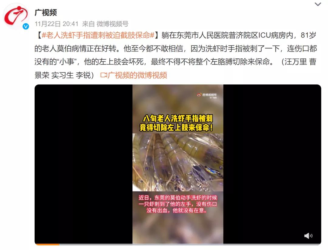 廣州日報在11月也報道稱,東莞一位老人在洗蝦時,被一只蝦刺到左手,因沒出血也不疼,便未在意。兩天后,左上肢開始腫痛不能動,送醫(yī)后左上肢壞死、休克住進(jìn)了ICU,經(jīng)檢測為感染創(chuàng)傷弧菌。最后老人接受了左上肢截肢手術(shù),保住了性命。