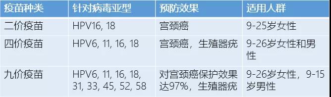 二價疫苗適用于9~25歲女性,四價疫苗適用于9~26歲女性和男性,對男性主要是預(yù)防HPV引起的生殖器疣。九價疫苗適用于9~26歲女性,以及9~15歲男性。