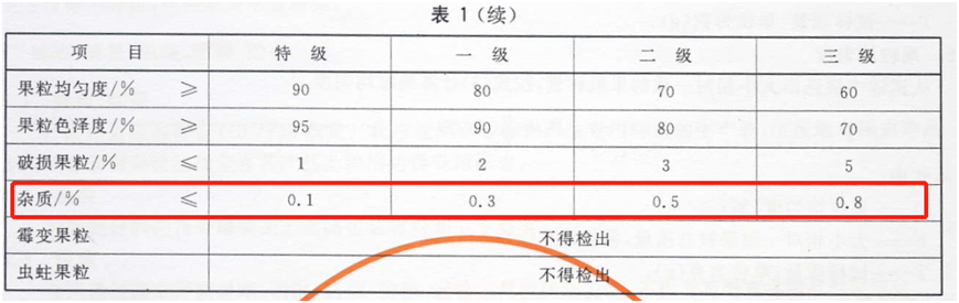 根據(jù)GB/T19586-2008《地理標(biāo)志產(chǎn)品 吐魯番葡萄干》中的標(biāo)準(zhǔn),對不同等級葡萄干的雜質(zhì)含量也做出了明確的規(guī)定,特級的要求雜質(zhì)的含量≤0.1%,這真的很低了。