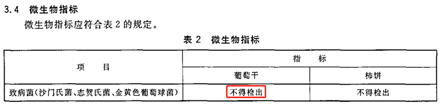 根據(jù)GB16325-2005《干果食品衛(wèi)生標(biāo)》要求,葡萄干中不得檢出致病菌。