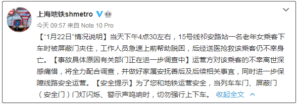 1月22日下午4點30左右,上海地鐵15號線祁安路站一名老年女乘客下車時被屏蔽門夾住,工作人員急速上前,試圖幫助脫困,后經(jīng)送醫(yī)搶救該乘客仍不幸身亡。