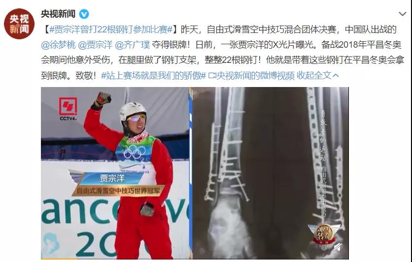 2022年2月10日,中國自由式滑雪混合團(tuán)體在冬奧會摘得銀牌,一張“鋼鐵俠”賈宗洋小腿骨折的X光引人淚目,從圖片上可以看出,賈宗洋曾經(jīng)發(fā)生過小腿脛腓骨粉碎性骨折伴有內(nèi)踝骨折,這是一種十分嚴(yán)重的損傷,通過手術(shù)治療,在腿里做了鋼釘支架,有22根鋼釘。