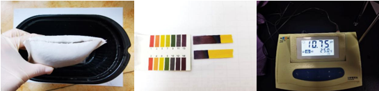 (左.加熱完成后加熱包變成石塊樣物質(zhì);中.PH試紙條測試加熱剩余水;右.PH計測試加熱剩余水)