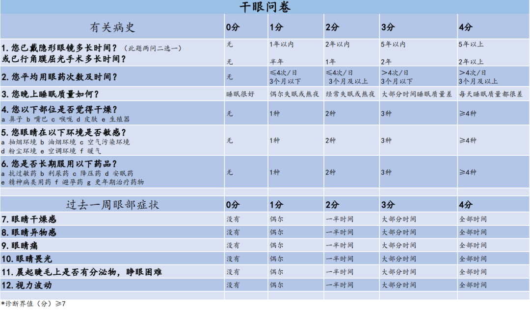 另外,覺得眼睛干不一定就是干眼。平時如果覺得眼睛有干澀、不適的感覺,可以先通過干眼問卷量表(見下表),初步判斷自己的干眼情況。如果比較嚴重則需要去醫(yī)院通過淚河寬度、淚膜破裂時間以及淚液分泌實驗Ⅰ等檢查來進一步明確自己的淚液情況。