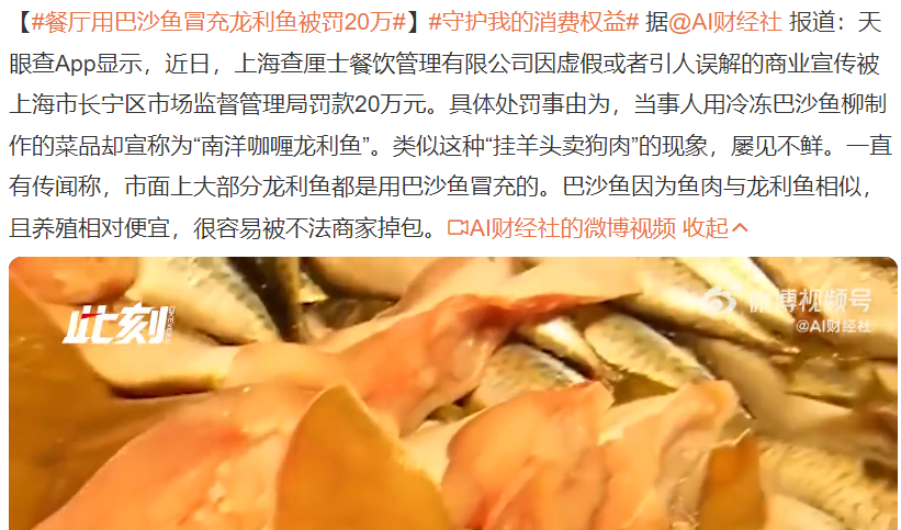 這兩種魚的外形雖然有很大的差別,但是經(jīng)常會有人把巴沙魚的魚柳冷凍后,使用機(jī)器將形狀加工到與龍利魚類似,從而使巴沙魚更好售出。商家使用巴沙魚冒充龍利魚,毫無疑問是一種以次充好、欺騙消費(fèi)者的行為,這種投機(jī)取巧的商家被市監(jiān)局罰款也是正常的。