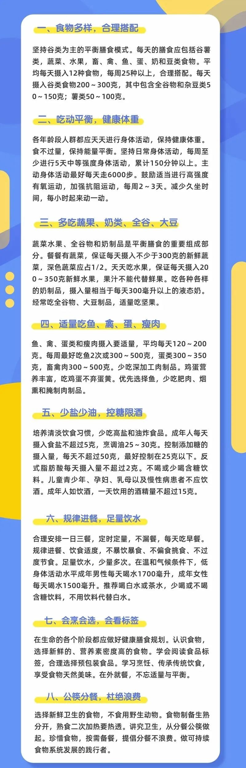 俗話說,民以食為天。吃雖然是維持生命的最基本的行為,但吃得科學(xué)才可以保持營養(yǎng)良好、預(yù)防慢性病,讓健康狀態(tài)更持久。《中國居民膳食指南(2022)》提出了平衡膳食八條準(zhǔn)則,供大家參考、應(yīng)用。