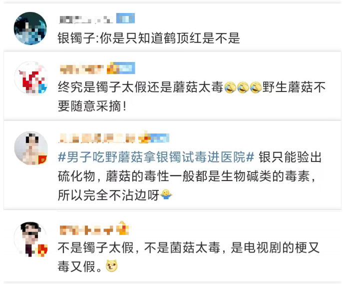 專家解釋:“蘑菇跟銀器、生姜、大米、生蔥一起煮,液體變黑有毒,顏色不變則無毒”等說法并無科學(xué)依據(jù),實際上蘑菇毒素不能跟銀器等發(fā)生化學(xué)反應(yīng),也不能產(chǎn)生顏色變化。如鵝膏毒素就不能發(fā)生顏色反應(yīng)。