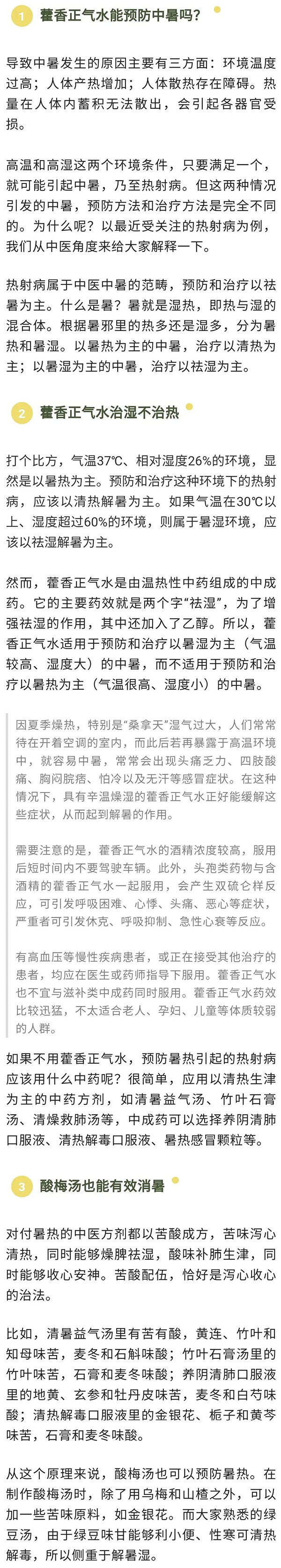 中國(guó)中醫(yī)科學(xué)院西苑醫(yī)院藥學(xué)部副主任藥師金銳前幾日外出,看見(jiàn)樓下管道施工工人正在作業(yè),工具包外放著幾盒打開(kāi)的藿香正氣水,想必是為了預(yù)防中暑而準(zhǔn)備的。但問(wèn)題是,在目前這種晴朗炎熱的天氣里,藿香正氣水真的可以預(yù)防中暑,甚至熱射病嗎?