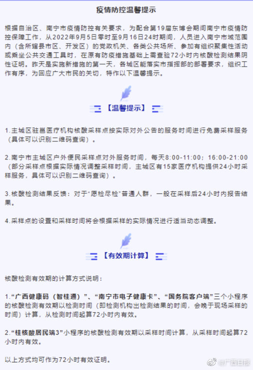 1.“廣西健康碼(智桂通)”“南寧市電子健康卡”“國(guó)務(wù)院客戶端”三個(gè)小程序的核酸檢測(cè)有效期以檢測(cè)時(shí)間(即檢測(cè)機(jī)構(gòu)出檢測(cè)結(jié)果的時(shí)間,會(huì)晚于現(xiàn)場(chǎng)采樣的時(shí)間)計(jì)算,從檢測(cè)時(shí)間起算72小時(shí)內(nèi)有效。