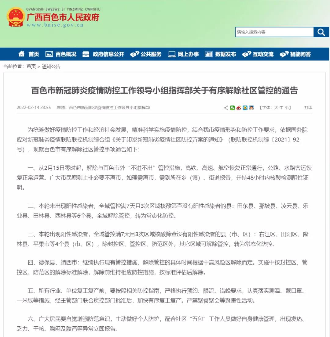 為統(tǒng)籌做好疫情防控工作和經(jīng)濟社會發(fā)展,精準科學實施疫情防控,結(jié)合百色市疫情形勢和防控工作要求,依據(jù)國務院應對新冠肺炎疫情聯(lián)防聯(lián)控機制綜合組《關(guān)于印發(fā)新冠肺炎疫情社區(qū)防控方案的通知》(聯(lián)防聯(lián)控機制綜〔2021〕92號),現(xiàn)就百色市有序解除社區(qū)管控事項通告如下:
