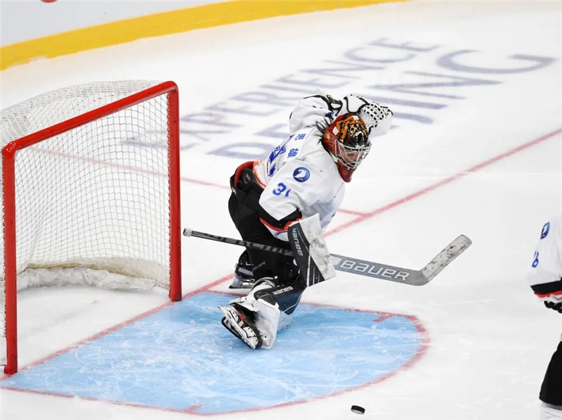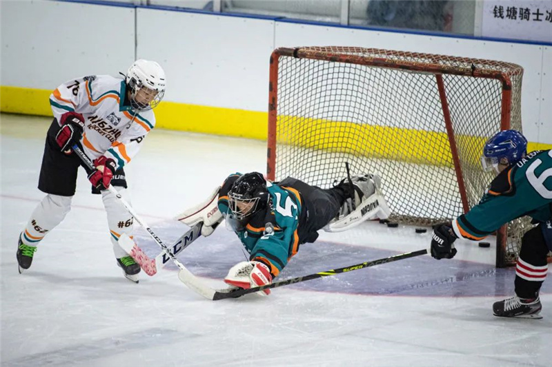 △2021年12月24日,杭州一冰球隊隊員包盛杰(中)在隊內(nèi)對抗賽中撲救。新華社記者江漢攝