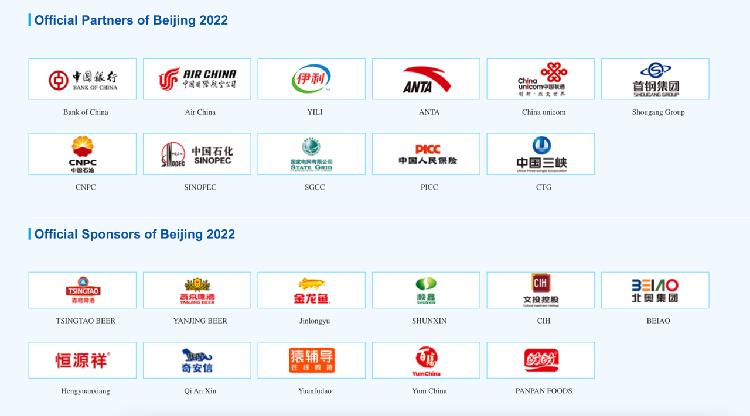 在北京冬奧會組委會贊助商計劃中,簽約企業(yè)全為中國企業(yè),包括中國銀行、中國國航、伊利集團、安踏公司、中國聯通、首鋼集團、中國石油、中國石化、國家電網、中國人保、中國三峽等11家方合作伙伴,以及青島啤酒、恒源祥、百勝中國、盼盼等11家官方贊助商。因此,中外運動員、教練員及各國奧組委官員在奧運村的生活都離不了中國企業(yè)方方面面的支持。