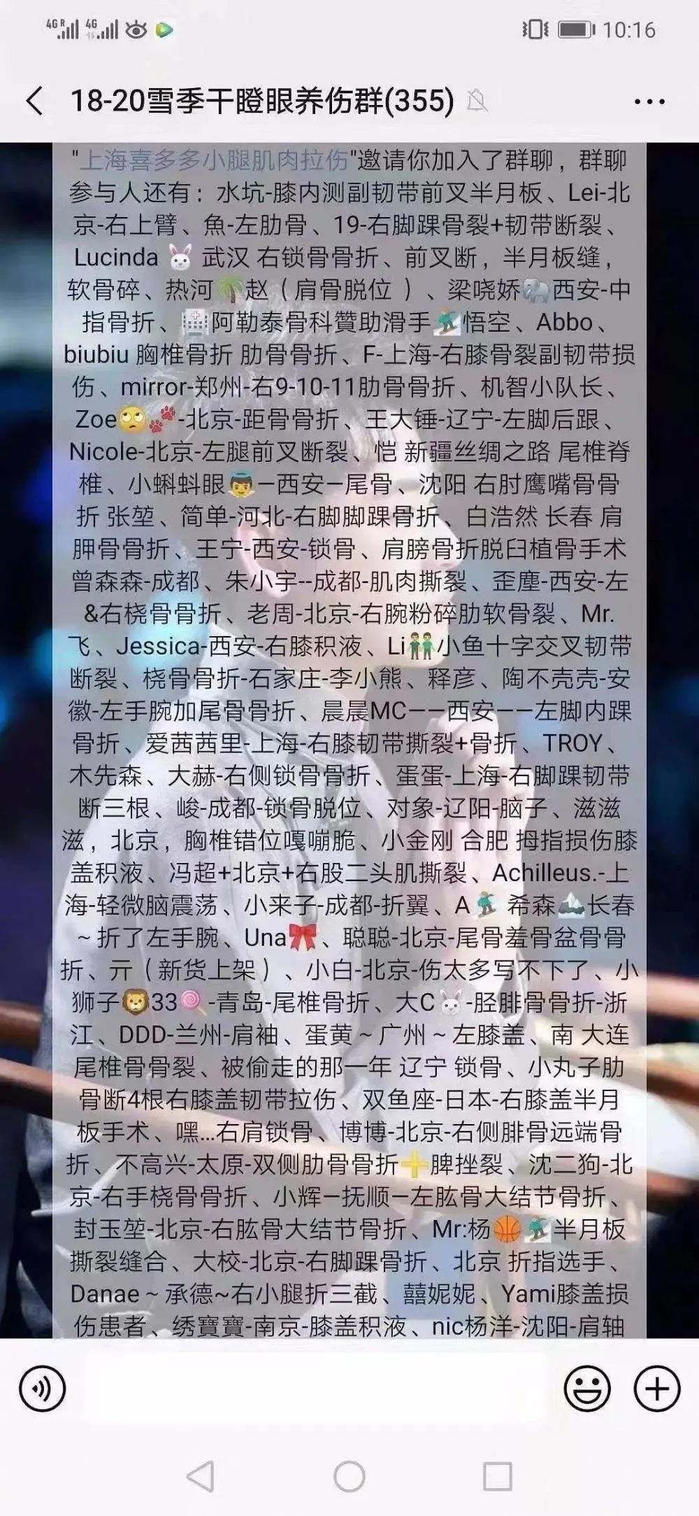 一張是“18-20雪季干瞪眼養(yǎng)傷群”截圖,群成員用“姓名-坐標(biāo)-受傷部位”作為備注,群里355人,顯示每個人都因滑雪受傷;