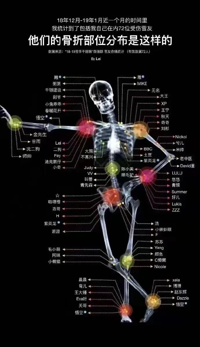另一張圖是網(wǎng)友統(tǒng)計了72位受傷雪友的骨折部位,并在人體骨骼解剖圖上一一做出標(biāo)記;