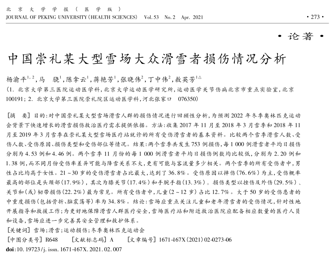 發(fā)表于《The Journal of Sports Medicine and Physical Fitness》(《運動醫(yī)學(xué)與身體健康雜志》)2018年6月第59卷的《An epidemiologic analysis of winter sport accidents on ski slopes comparing two seasons》(《兩個雪季中滑雪場冬季運動事故的流行病學(xué)分析》)、