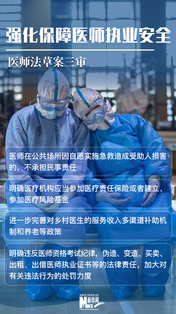 醫(yī)患沖突時有發(fā)生,為加強保障醫(yī)師執(zhí)業(yè)安全,醫(yī)師法草案在總則中明確規(guī)定,醫(yī)師依法執(zhí)業(yè),受法律保護,醫(yī)師的人格尊嚴、人身安全不受侵犯,并專設一章完善各項保障措施,明確縣級以上人民政府及其有關部門、醫(yī)療衛(wèi)生機構的職責,禁止任何組織或者個人阻礙醫(yī)師依法執(zhí)業(yè),干擾醫(yī)師正常工作、生活。在此基礎上,草案三次審議稿進一步充實完善相關規(guī)定: