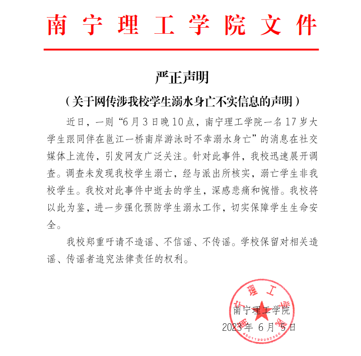 針對此事件,南寧理工學院迅速展開調(diào)查。調(diào)查未發(fā)現(xiàn)南寧理工學院學生溺亡,經(jīng)與派出所核實,溺亡學生非南寧理工學院學生。對此事件中逝去的學生,南寧理工學院深感悲痛和惋惜。南寧理工學院將以此為鑒,進一步強化預(yù)防學生溺水工作,切實保障學生生命安全。