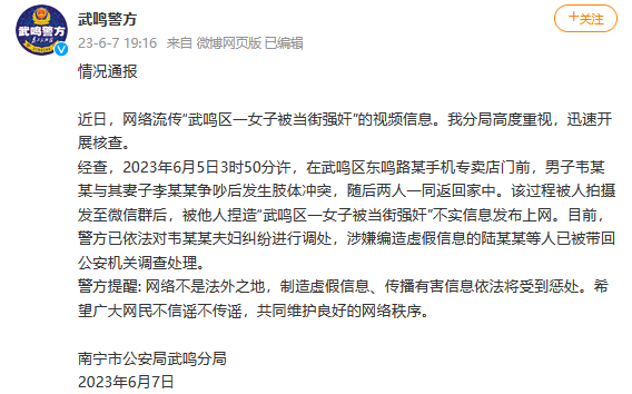 該過程被人拍攝發(fā)至微信群后,被他人捏造“武鳴區(qū)一女子被當街強奸”不實信息發(fā)布上網(wǎng)。
