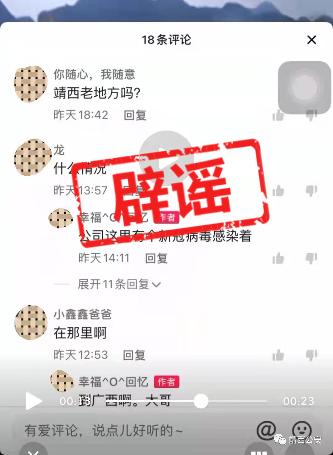 經(jīng)查,2022年3月13日11時(shí)許,龍某和幾個(gè)工友在去公司的籃球場(chǎng)采集核酸途中,拍了一段短視頻并上傳抖音。14時(shí)11分,龍某在視頻留言區(qū)回復(fù)網(wǎng)友一條信息,稱“公司這里有個(gè)新冠病毒感染著”的不實(shí)信息。經(jīng)過(guò)詢問(wèn),龍某對(duì)自己在疫情期間散布不實(shí)信息的行為供認(rèn)不諱。