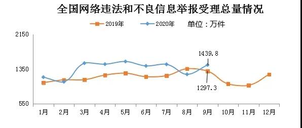 2020年9月,全國各級網(wǎng)絡(luò)舉報部門受理舉報1439.8萬件,環(huán)比增長16.3%、同比增長11.0%。其中,中央網(wǎng)信辦(國家互聯(lián)網(wǎng)信息辦公室)違法和不良信息舉報中心受理舉報18.8萬件,環(huán)比下降20.6%、同比增長2.9%;各地網(wǎng)信辦舉報部門受理舉報140.1萬件,環(huán)比下降0.9%、同比下降3.4%;全國主要網(wǎng)站受理舉報1280.9萬件,環(huán)比增長19.4%,同比增長13.0%。