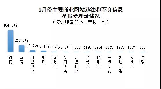 在全國主要網(wǎng)站受理的舉報中,微博、百度、阿里巴巴、騰訊、新浪網(wǎng)、今日頭條等主要商業(yè)網(wǎng)站受理量占78.0%,達999.4萬件。