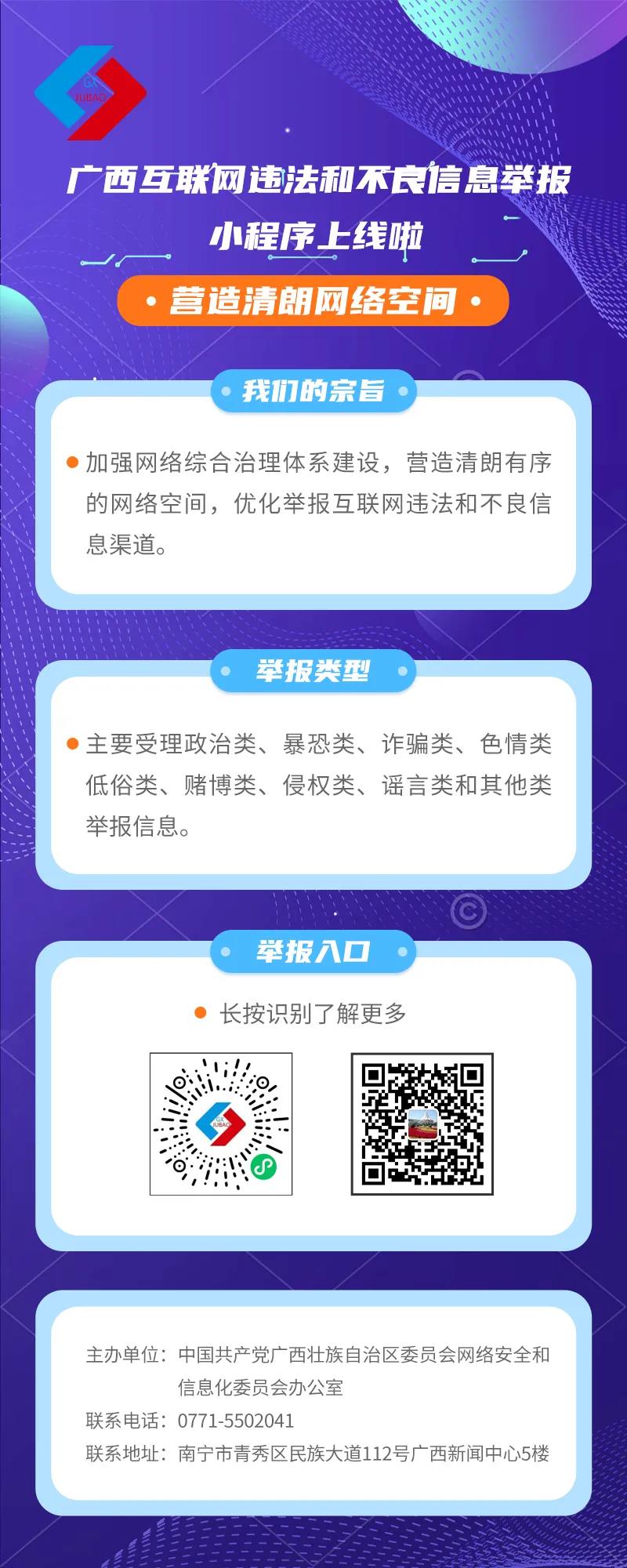 互聯(lián)網(wǎng)高度普及帶給人們便利的同時,也出現(xiàn)了網(wǎng)絡(luò)詐騙、黃賭毒、暴恐以及網(wǎng)絡(luò)謠言等違法和不良信息,嚴(yán)重?fù)p害國家安全和人民利益。為加強(qiáng)網(wǎng)絡(luò)綜合治理體系建設(shè),營造清朗有序的網(wǎng)絡(luò)空間,由自治區(qū)黨委網(wǎng)信辦組織開發(fā)的“廣西互聯(lián)網(wǎng)違法和不良信息舉報(bào)”小程序今天上線啦!您可以通過該程序舉報(bào)互聯(lián)網(wǎng)違法和不良信息,了解舉報(bào)工作動態(tài)、處置案例、舉報(bào)指南、法律法規(guī),查看舉報(bào)信息的處置進(jìn)度和回復(fù)內(nèi)容。