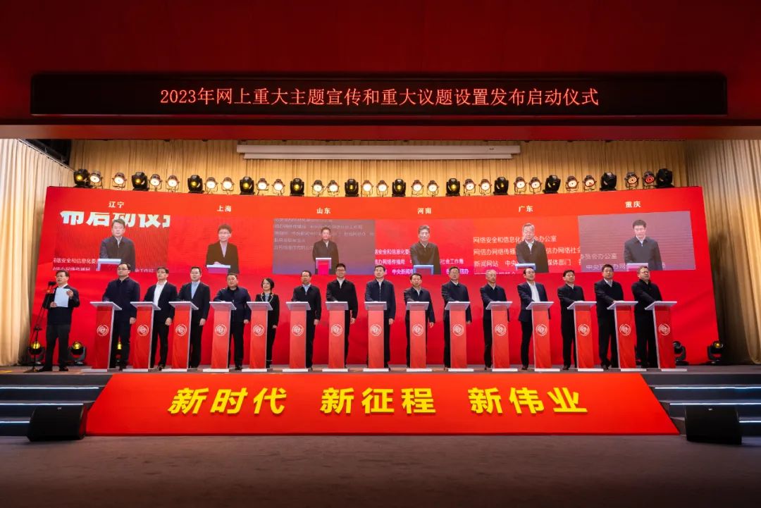 發(fā)布啟動儀式由中央網(wǎng)信辦副主任、國家網(wǎng)信辦副主任盛榮華主持。中央網(wǎng)信辦副主任、國家網(wǎng)信辦副主任牛一兵介紹2023年網(wǎng)上重大主題宣傳和重大議題設(shè)置有關(guān)情況。中央政法委副秘書長王洪祥,民政部黨組成員、副部長詹成付,退役軍人事務(wù)部黨組成員、副部長馬飛雄,國家體育總局副局長、黨組副書記王瑞連,人民日報社副總編輯徐立京,新華通訊社副社長、黨組成員趙承,光明日報社社長兼總編輯王慧敏,經(jīng)濟(jì)日報社社長兼總編輯鄭慶東,中國日報社社長兼總編輯曲瑩璞,中國國家鐵路集團(tuán)有限公司副總經(jīng)理、黨組成員錢銘,中國聯(lián)合網(wǎng)絡(luò)通信有限公司總經(jīng)理陳忠岳,中央廣播電視總臺、中央宣傳部新聞局負(fù)責(zé)同志在北京主會場出席發(fā)布啟動儀式。