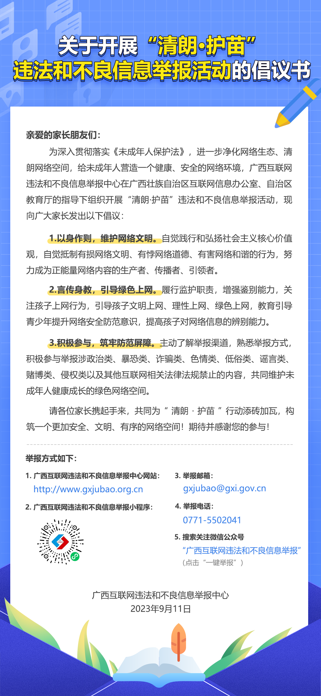 為深入推進(jìn)“我為群眾辦實(shí)事”,保護(hù)未成年人健康成長(zhǎng),給未成年人營造一個(gè)健康、安全的網(wǎng)絡(luò)環(huán)境,9月11日,廣西網(wǎng)信辦聯(lián)合廣西教育廳在南寧開展“清朗·護(hù)苗”違法和不良信息舉報(bào)倡議活動(dòng),以發(fā)放電子倡議書的形式,向全區(qū)中小學(xué)生家長(zhǎng)發(fā)出倡議,號(hào)召共同參與互聯(lián)網(wǎng)違法和不良信息舉報(bào),共同為未成年人構(gòu)筑一個(gè)更加安全、文明、有序的網(wǎng)絡(luò)空間。