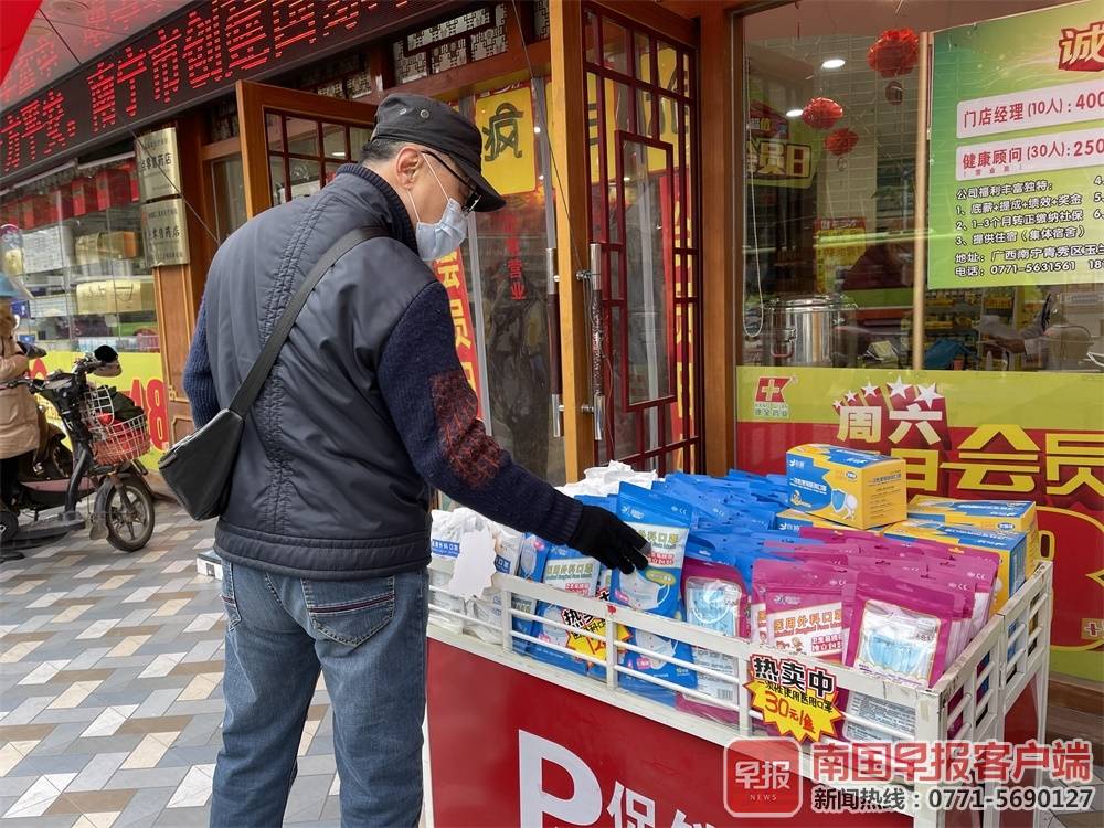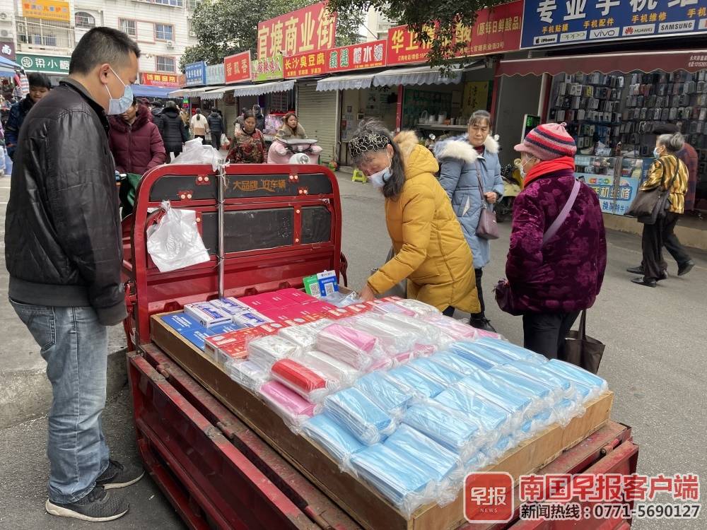 1月8日下午6時(shí),記者在南寧市官塘商業(yè)街看到,在一輛三輪車前,幾名老人正在挑選口罩。賣口罩的男子說(shuō):“兩角錢一個(gè)口罩,50個(gè)一包,再不買就要漲價(jià)了?!甭?tīng)到這里,一名老人掏錢買了一包。