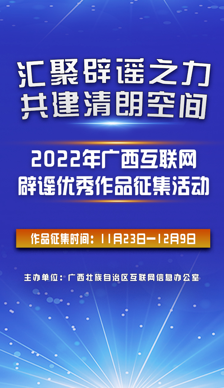 為提高廣大網(wǎng)民參與網(wǎng)絡(luò)辟謠作品征集活動(dòng)的積極性,廣泛動(dòng)員社會(huì)各方面力量積極參與網(wǎng)絡(luò)辟謠,宣傳辟謠工作成效,形成全民參與互動(dòng)的良好局面,共同構(gòu)建清朗網(wǎng)絡(luò)家園,廣西壯族自治區(qū)互聯(lián)網(wǎng)信息辦公室開展2022年廣西互聯(lián)網(wǎng)辟謠優(yōu)秀作品征集活動(dòng)。