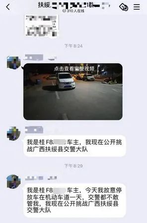 10月9日晚,一名男子在微信群里發(fā)布“我是桂F8****車主,我現(xiàn)在公開(kāi)挑戰(zhàn)廣西扶綏縣交警大隊(duì),今天我故意停放車在機(jī)動(dòng)車道一天,交警都不敢管我”的信息。