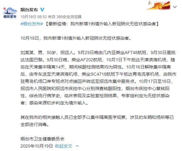 據(jù)煙臺發(fā)布官博消息,10月19日,山東省衛(wèi)生健康委員會和煙臺市衛(wèi)生健康委員會相繼公布煙臺市新增1例境外輸入新冠肺炎無癥狀感染者信息后,部分自媒體和社交平臺未經(jīng)核實即發(fā)布信息稱“煙臺市報告無癥狀感染者1例,目前共追蹤到密切接觸者26350人,其在煙臺市的562名相關(guān)接觸人員已全部予以集中隔離醫(yī)學(xué)觀察?!痹撔畔⑾祵ι綎|省衛(wèi)生健康委員會10月18日0時至24時疫情通報的錯誤解讀。