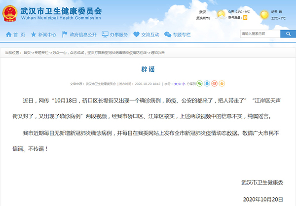 真相:網(wǎng)傳“硚口區(qū)長(zhǎng)堤街又出現(xiàn)一個(gè)確診病例”“江岸區(qū)天聲街又出現(xiàn)了確診病例”的信息純屬謠言,武漢市近期無(wú)新增新冠肺炎確診病例。武漢市衛(wèi)健委每日在其網(wǎng)站上發(fā)布全市新冠肺炎疫情動(dòng)態(tài)數(shù)據(jù),請(qǐng)廣大網(wǎng)民不信謠、不傳謠,通過(guò)官方渠道獲取信息。