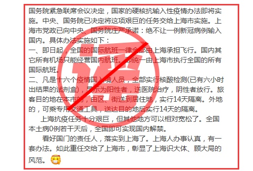 近日,朋友圈流傳一則信息,該條內(nèi)容稱:“國(guó)務(wù)院緊急聯(lián)席會(huì)議決定,國(guó)家的硬核抗輸入性疫情辦法即將實(shí)施。中央、國(guó)務(wù)院已決定將這項(xiàng)艱巨的任務(wù)交給上海市實(shí)施?!鄙虾]斎胄苑酪哒哂袩o(wú)變化一時(shí)引發(fā)網(wǎng)友關(guān)注。