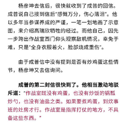 在成普回復(fù)與毛岸英一起犧牲的高瑞欣之女楊彥坤的信中,也相當(dāng)激動(dòng)地駁斥道:“作戰(zhàn)室既沒(méi)有雞蛋,也沒(méi)有炒飯的鍋瓢炒勺,也沒(méi)有油鹽之類。如果要煮雞蛋,到炊事班的灶房才行。作戰(zhàn)室是指揮打仗的地方,不具備這些東西?!?/p>